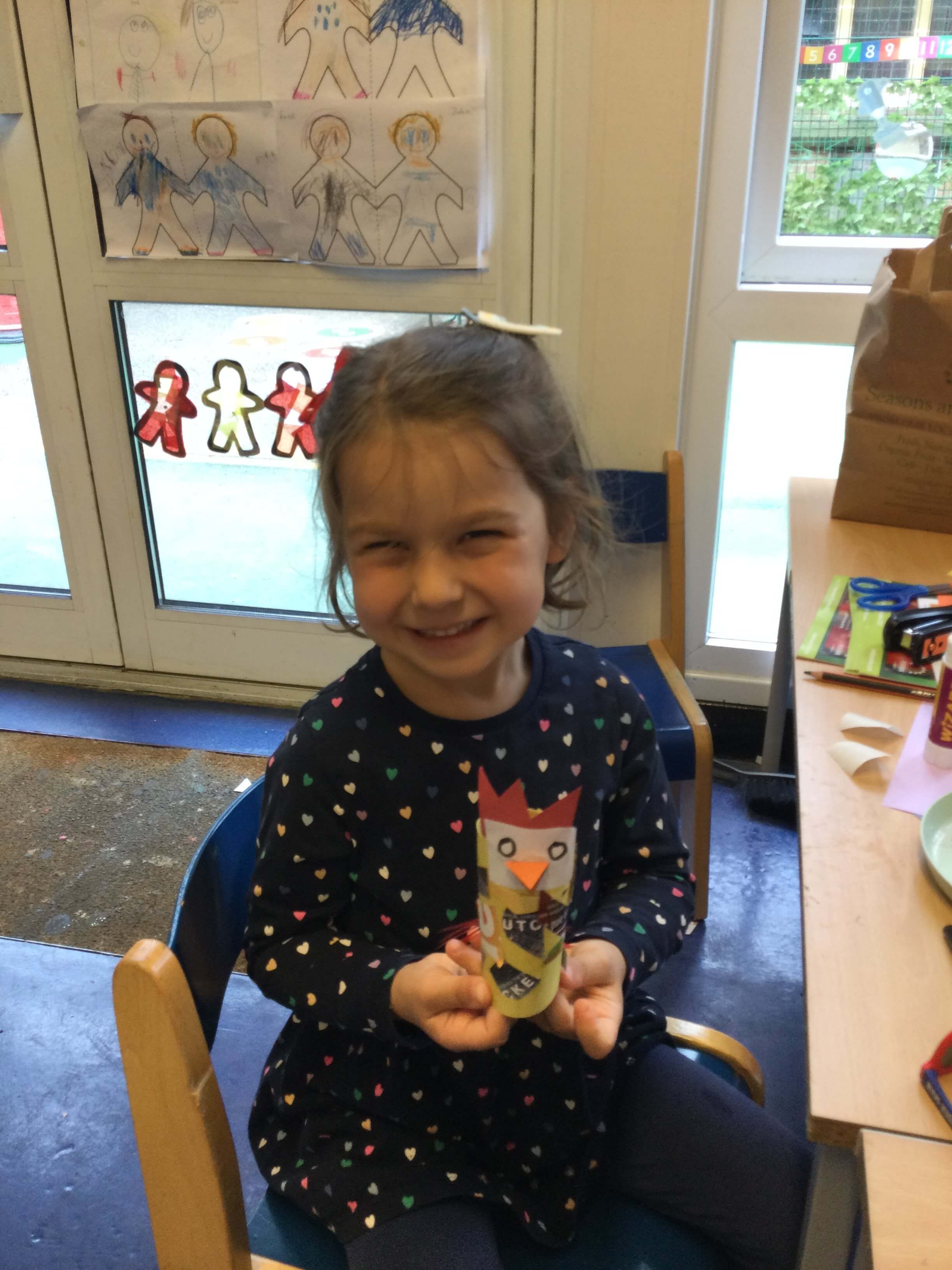 Made roosters out of rolls and collaged them with magazine pages.